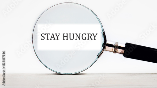 Concept Phase STAY HUNGRY focused through a magnifying glass