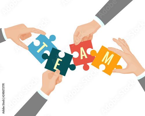 Concept with hands and puzzles. Flat background with Teamwork businessman. Hand holding part of puzzle. Vector