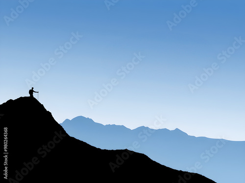 Conceptual business man silhouette on top of a mountain with a blue sky background