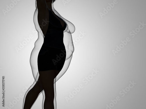 Conceptual fat overweight obese female vs slim fit healthy body after weight loss or diet with muscles thin young woman on gray. A fitness, nutrition or fatness obesity, health shape 3D illustration