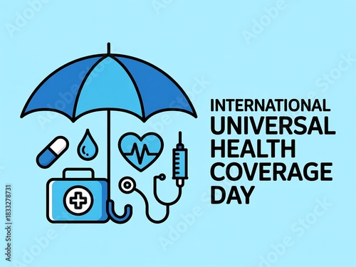 Conceptual Graphic for International Universal Health Coverage Day: Umbrella Protection, Medical Icons, and Global Access