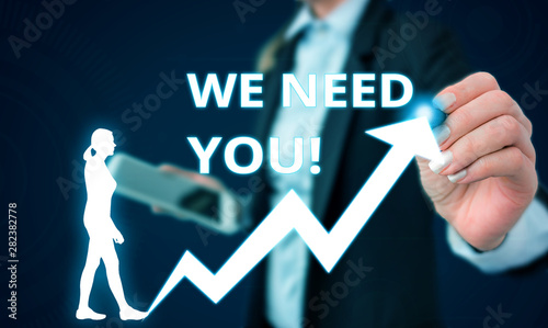 Conceptual hand writing showing We Need You. Concept meaning asking someone to work together for certain job or target Female human wear formal work suit presenting smart device