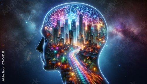 Conceptual image of a human head silhouette with a brain made of bustling cityscape, representing complex thoughts and urban consciousness