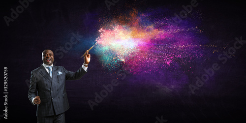 Conceptual image of ambitious and creative businessman in black suit holding paintbrush in hand
