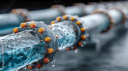 Conceptual low-poly illustration of a high-tech oil pipeline with glowing grid overlay and liquid simulation in motion