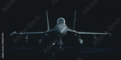 Conceptual representation of the frontal view of a modern dark fighter jet standing on the ground ready for combat and parked