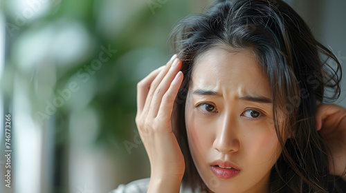 Concerned Asian woman examines scalp for hair loss.