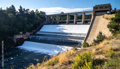 Concrete dam structure on sunny day