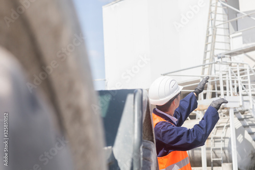 concrete worker waving with arms in a concrete factory