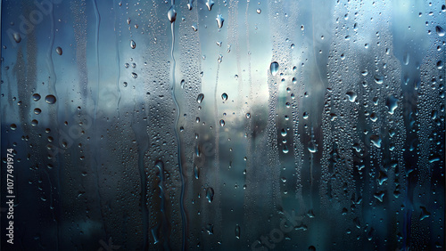 Condensation on window with water droplets, cool ambiance, copy space for text