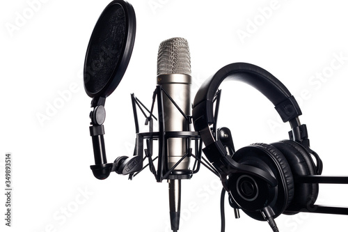 Condenser microphone and closeup. Pop filter, white background