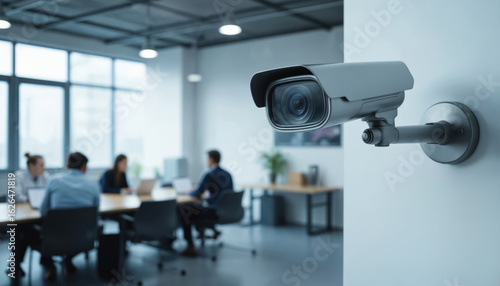 Conference room with white ceiling, walls, table, chairs. Two people discuss, large window, modern interior design. Security camera mounted on wall, monitoring, surveillance system, business office