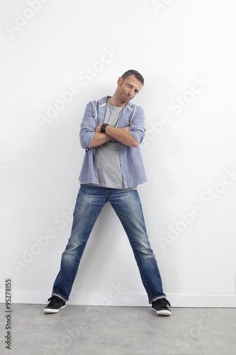 confident 40s man standing with arms folded for protection