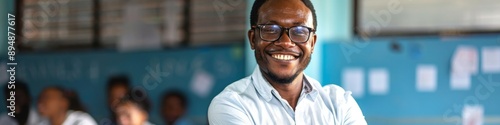 Confident African Male Educator Poses in Classroom: Exemplifying Teaching Excellence and Diversity. Smiling Teacher with Crossed Arms Represents Strong Faculty, Campus Life, and Back-to-School Spirit