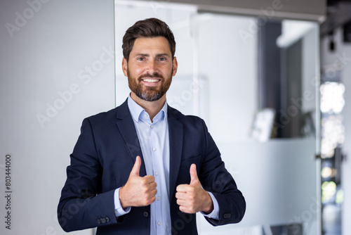 Confident business executive giving a thumbs up in modern office
