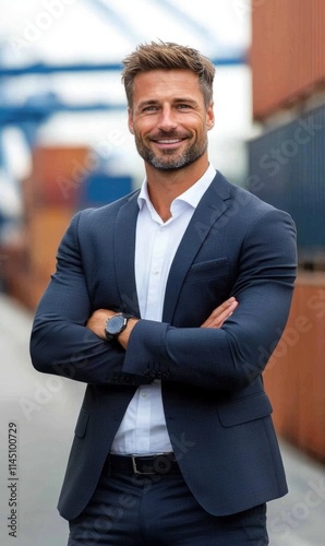 Confident business professional standing with arms crossed at a shipping yard in a modern urban setting
