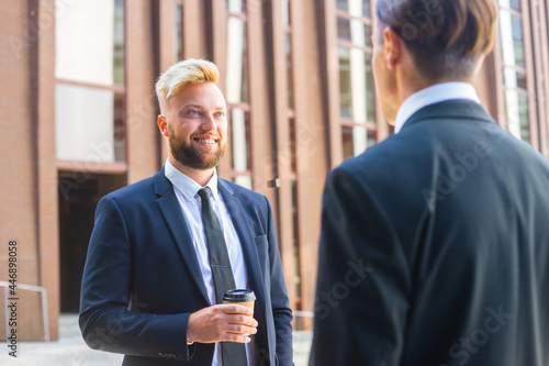 Confident businessman and his colleague in front of modern office building. Financial investors are talking outdoor. Banking and business.