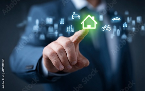 Confident businessman embracing smart home technology and green energy solutions, symbolizing future innovation and sustainability in modern business.