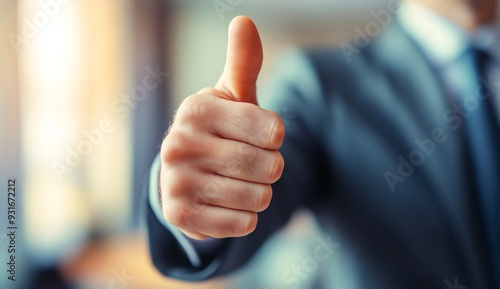 Confident businessman in a suit giving a thumbs up at the office, with copy space for text. Business success concept. A man showing a thumbs up sign. Blurred background of a modern office.