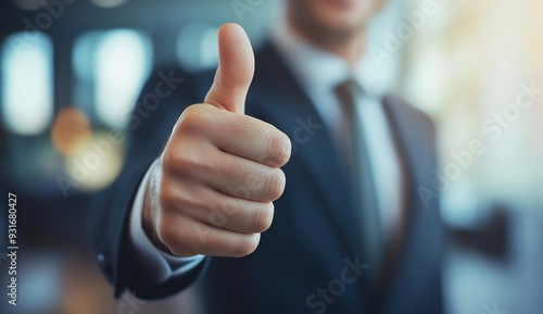 Confident businessman in a suit giving a thumbs up at the office, with copy space for text. Business success concept. A man showing a thumbs up sign. Blurred background of a modern office.