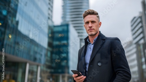 Confident Businessman in Modern Cityscape Holding Smartphone