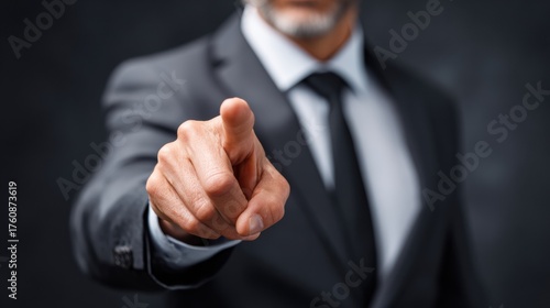 Confident businessman in suit pointing finger toward camera, gesture conveying decision and leadership in corporate setting, dramatic lighting and shallow depth of field