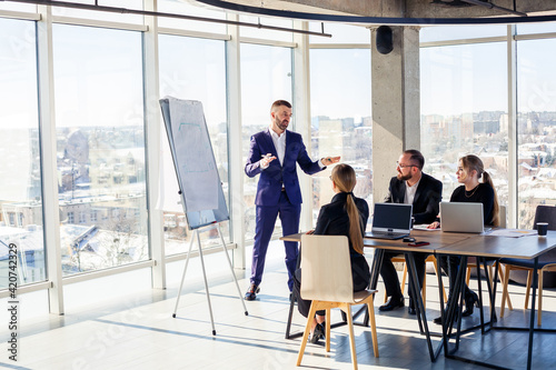 Confident businessman makes a presentation of a new project in the boardroom at a company meeting. Beautiful auditors talk with different partners about the business using a whiteboard and graphs.