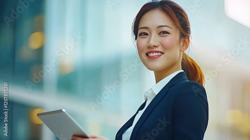 Confident Businesswoman Holding Tablet in Modern City Setting