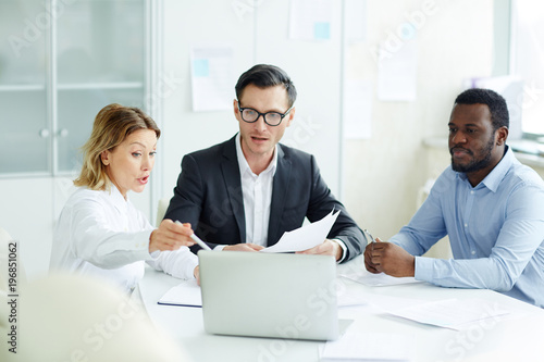 Confident businesswoman pointing at laptop display and explaining dollar fluctuations while making presentation for cilleagues at working meeting
