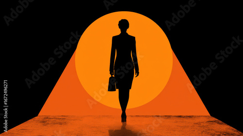 Confident businesswoman silhouette stands against vibrant orange sunset, exuding empowerment and determination. scene captures essence of ambition and success