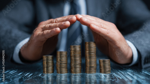 Confident Executive Shielding Ascending Coin Stacks, Symbolizing Financial Growth, Wealth Protection and Secure Investments