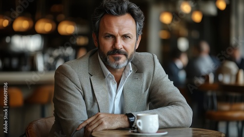 Confident man enjoying coffee in a modern cafe, relaxing atmosphere.