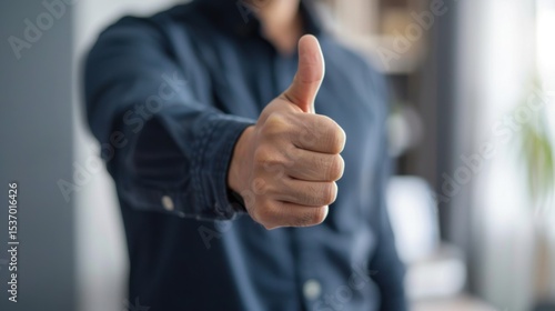 Confident man gives thumbs up symbolizing approval and success in a bright soft focused office with
