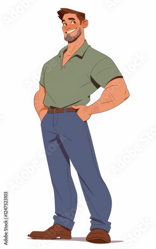 Confident man in olive green polo shirt, blue pants, and brown shoes, full-body portrait