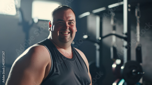 Confident man with a friendly smile takes a break in a gym setting.