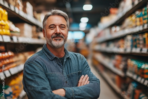 Confident Mature Man Smiling in Grocery Aisle. Happy Shopping Experience in Modern Supermarket