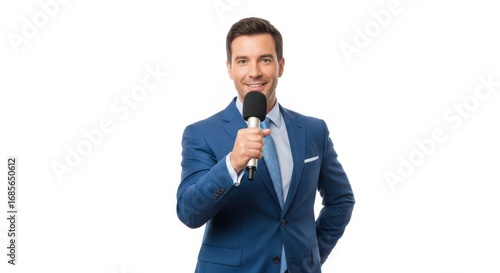 Confident presenter in a suit holding a microphone on an isolated background