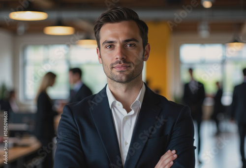 Confident startup COO in an open-plan workspace, showcasing leadership