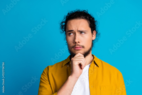 Confident thoughtful man in casual yellow shirt against blue background gesture suggests pondering or decision making
