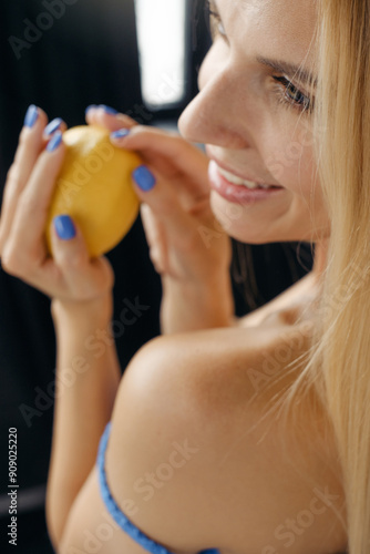 Confident woman with long hair playfully holds lemon, sensuality and tenderness
