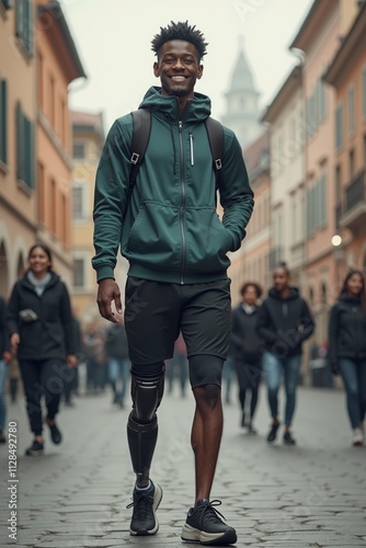 Confident young black man with a prosthetic leg walks through a vibrant city street surrounded by diverse pedestrians during the day