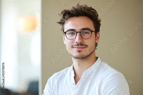 Confident Young Man in Casual Attire Smiling for the Camera in Modern Interior