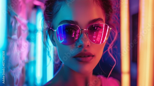 Confident young woman in stylish sunglasses poses confidently in front of vibrant neon lights