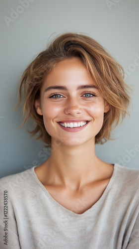 Confident young woman smiling warmly against blurred neutral backdrop