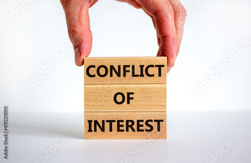 Conflict of interest symbol. Wooden blocks with words 'conflict of interest'. Beautiful white background, businessman hand. Copy space. Business and conflict of interest concept.