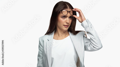 confused businesswoman in grey blazer adjusting eyeglasses isolated on white.
