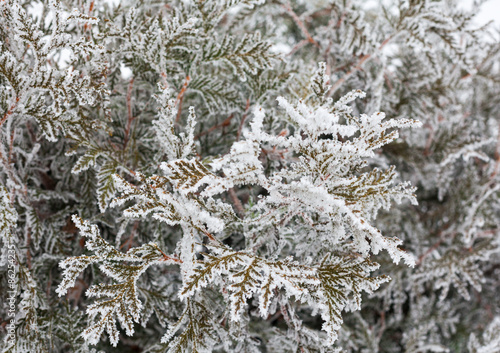 Coniferous branches covered with hoarfrost