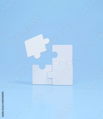 Connecting puzzle pieces on blue background. Idea, solution, strategy concept, business.