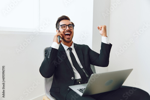 Connection man chair mobile talk smile businessman phone video computer technology laptop call phone office business