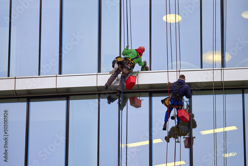 Construction climbing. Workers clean the glass facade of an office building. Window cleaners